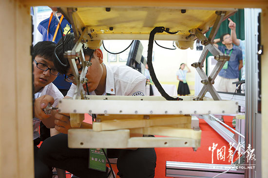 7月26日,2014“挑战杯”全国职业学校创新创效创业大赛在浙江杭州开幕,参赛选手在调试参赛作品。本报记者 赵迪摄