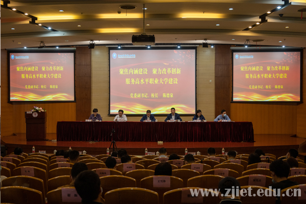 党委副书记、校长陈德泉作“聚焦内涵建设、聚力改革创新、服务高水平职业大学建设——2022年教学工作思路”报告。他指出,2022年是党的二十大召开之年,也是全面开启“十四五”高质量发展新篇章的关键之年,学校要以习近平新时代中国特色社会主义思想为指导,以体制创新和教育综合评价改革为驱动力,以产教融合、专业群建设、信息化改革和国际化合作为重点,深入推进“双高”建设和“提质培优”行动计划,高质量完成中期绩效评价,全力推进学校新一轮高水平高质量发展,不断提升学校整体办学实力。